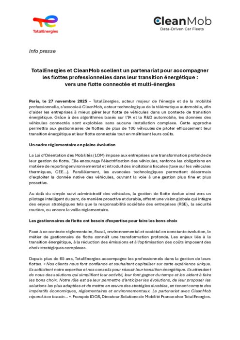 TotalEnergies, acteur majeur de l’énergie et de la mobilité professionnelle, s’associe à CleanMob, acteur technologique de la télématique automobile, afin d’aider les entreprises à mieux gérer leur flotte de véhicules dans un contexte de transition énergétique. Grâce à des algorithmes basés sur l’IA et la R&D automobile, les données des véhicules connectés sont exploitées sans aucune installation complexe. Cette approche permettra aux gestionnaires de flottes de plus de 100 véhicules de piloter efficacement leur transition énergétique et leur flotte connectée tout en maîtrisant leurs coûts.