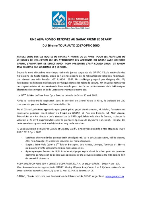 La 26ème édition du Tour Auto Optic 2ooo se déroule du 24 au 30 avril 2017. Mardi 25 avril, plusieurs apprentis ayant participé au projet de rénovation, M. Mullot, formateur en carrosserie peinture coordinateur du Projet au GARAC, et l’un des Experts, M. Alain Annon, suivront le véhicule le 25 avril jusqu’au Mans pour la première épreuve de régularité sur circuit.