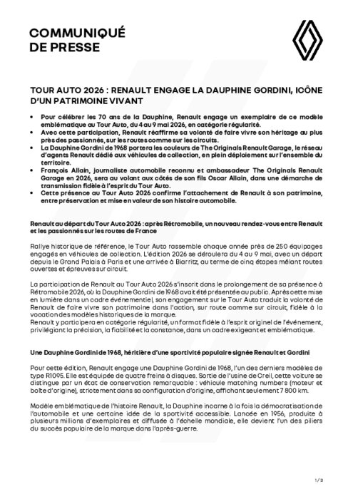 Rallye historique de référence, le Tour Auto rassemble chaque année près de 250 équipages engagés en véhicules de collection. L'édition 2026 se déroulera du 4 au 9 mai, avec un départ depuis le Grand Palais à Paris et une arrivée à Biarritz, au terme de cinq étapes mêlant routes ouvertes et épreuves sur circuit.