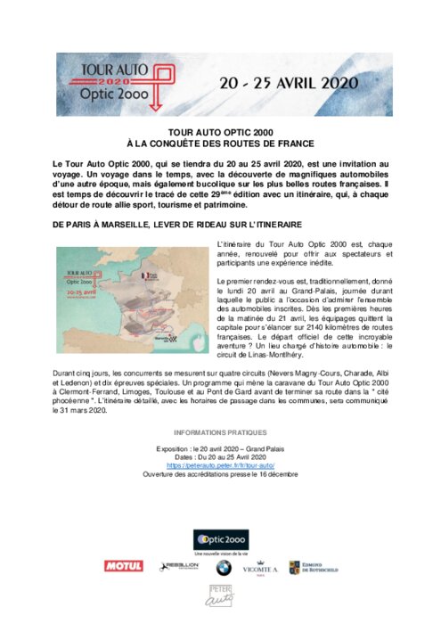 Le Tour Auto Optic 2000, qui se tiendra du 20 au 25 avril 2020, est une invitation au voyage. Un voyage dans le temps, avec la découverte de magnifiques automobiles d’une autre époque, mais également bucolique sur les plus belles routes françaises. Il est temps de découvrir le tracé de cette 29ème édition avec un itinéraire, qui, à chaque détour de route allie sport, tourisme et patrimoine.