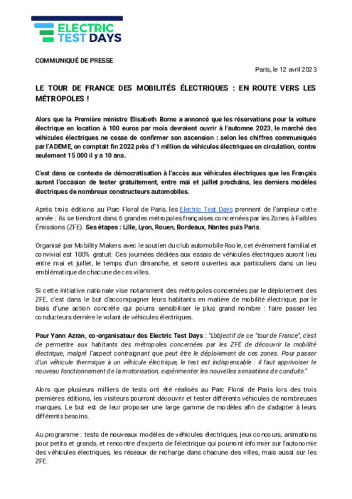 Après trois éditions au Parc Floral de Paris, les Electric Test Days prennent de l’ampleur cette année : ils se tiendront dans 6 grandes métropoles françaises concernées par les Zones à Faibles Émissions (ZFE). Ses étapes : Lille, Lyon, Rouen, Bordeaux, Nantes puis Paris.