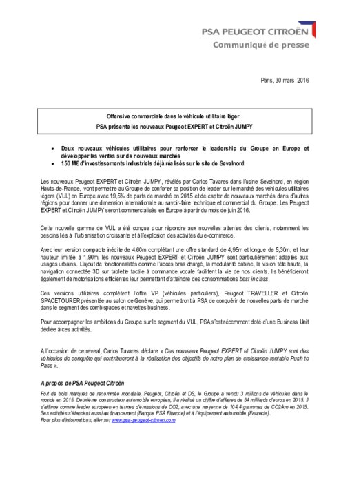 Les nouveaux Peugeot EXPERT et Citroën JUMPY, révélés par Carlos Tavares dans l'usine Sevelnord, en région Hauts-de-France, vont permettre au Groupe de conforter sa position de leader sur le marché des véhicules utilitaires légers (VUL) en Europe avec 19,5% de parts de marché en 2015 et de capter de nouveaux marchés dans d'autres régions pour donner une dimension internationale au savoir-faire technique et commercial du Groupe.