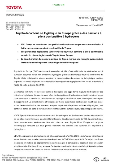 Toyota Motor Europe (TME) s’est associé au néerlandais VDL Groep (VDL) afin de pénétrer le marché européen des poids lourds zéro émission à hydrogène grâce à la technologie de pile à combustible de Toyota. Cette collaboration vise à accélérer la décarbonation du secteur de la logistique routière, laquelle a un impact important sur la réalisation des objectifs stratégiques de TME visant à atteindre la neutralité carbone totale d’ici 2040.