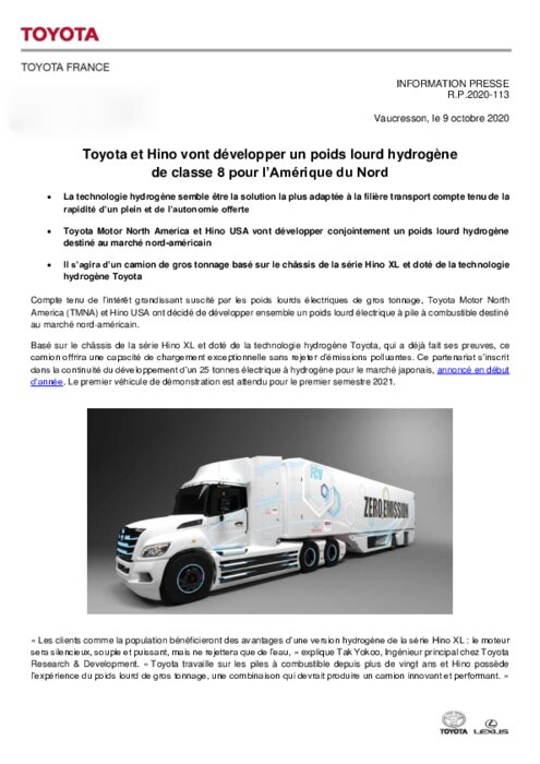 Ce projet fait suite à un autre accord entre Toyota et Hino annoncé en mars visant à développer pour le marché japonais un poids lourd de 25 tonnes roulant à l'hydrogène.