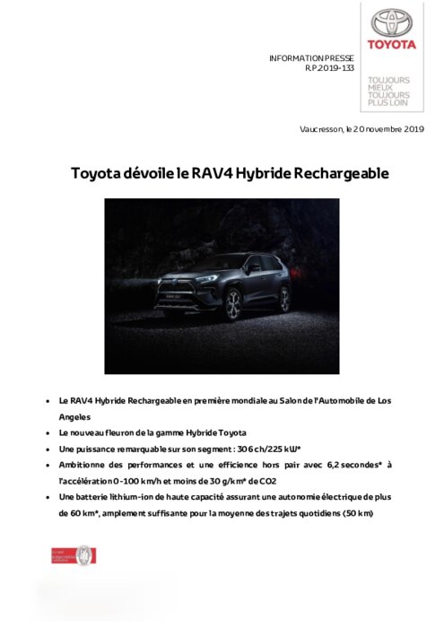 Toyota ouvre aujourd’hui un nouveau chapitre de l’histoire du RAV4, le pionnier des SUV - ces 4x4 de loisirs -, en présentant en première mondiale le RAV4 Hybride Rechargeable au Los Angeles Auto Show. Fruit de plus de vingt ans d’expertise en matière de motorisations hybrides-électriques, cette variante inédite se veut plus puissante, mais aussi plus sobre et plus propre que tout autre modèle du segment.