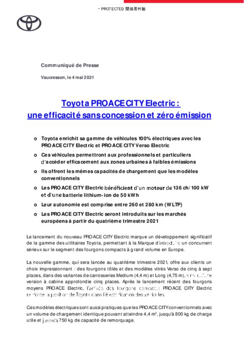 Le lancement du nouveau PROACE CITY Electric marque un développement significatif de la gamme des utilitaires Toyota, permettant à la Marque d'introduire un concurrent sérieux sur le segment des fourgons compacts à grand volume en Europe. La nouvelle gamme, qui sera lancée au quatrième trimestre 2021, offre aux clients un choix impressionnant : des fourgons tôlés et des modèles vitrés Verso de cinq à sept places, dans des variantes de carrosseries Medium (4,4 m) et Long (4,75 m)...