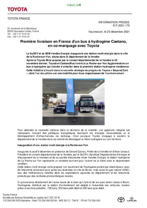 Le SyDEV et sa SEM Vendée Energie inaugurent une station multi-énergie dans la ville de la Roche-sur-Yon, située dans le département de la Vendée. Après la Toyota Mirai acquise par le conseil départemental de la Vendée le 26 novembre dernier, Toyota et CaetanoBus livrent à La Roche-sur-Yon Agglomération un bus à hydrogène qui viendra s’avitailler dans la première station hydrogène vendéenne.