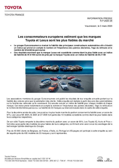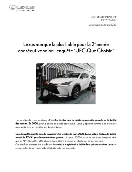 Pour la 2è année, Lexus est sur la plus haute marche du podium concernant la fiabilité avec un score de 97%. Les Lexus NX 300h, IS 300h et CT 200h font partie des 10 modèles considérés comme étant les plus fiables dans leurs catégories respectives. Toyota remporte la 2ème marche du podium avec un score de 95%. Les Toyota IQ, Auris et Prius + font elles aussi partie des modèles les plus fiables de leurs catégories, confirmant ainsi avec Lexus les avantages de la technologie hybride-électrique...