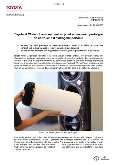 Toyota Motor Corporation (Toyota) et sa filiale Woven Planet Holdings, Inc. (Woven Planet) ont développé un prototype opérationnel de sa cartouche d'hydrogène portable. Ce conditionnement facilitera le transport et l'approvisionnement du combustible destiné à alimenter diverses applications courantes, à l'intérieur comme à l'extérieur des logements. Toyota et Woven Planet effectueront des essais de validation en divers lieux, notamment à Woven City.