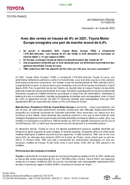 De janvier à décembre 2021, Toyota Motor Europe (TME) a immatriculé 1 076 300 véhicules – une hausse de 8% qui reflète la forte demande et surclasse un marché stable (+ 1% par rapport à 2020). En Europe, la marque Toyota se hisse à la deuxième place des ventes de VP. Une progression alimentée par la forte demande pour les différentes motorisations des gammes électrifiées Toyota et Lexus. TME a atteint en 2021 les objectis de CO2 fixés par l’UE pour son parc automobile...