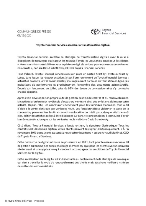 Toyota Financial Services accélère sa stratégie de transformation digitale avec la mise à disposition de nouveaux outils pour les réseaux Toyota et Lexus mais aussi pour les clients. " Nous souhaitons ainsi délivrer une expérience digitale unique pour nos concessionnaires et nos clients ", déclare David Schotkosky, CEO de Toyota Financial Services.