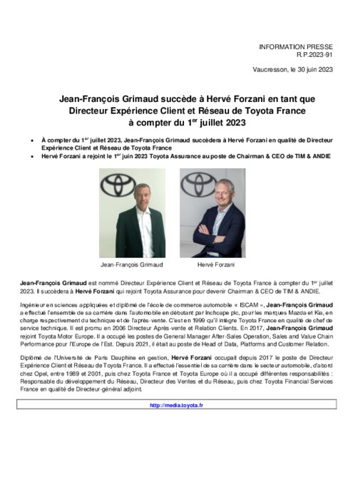 Jean-François Grimaud est nommé Directeur Expérience Client et Réseau de Toyota France à compter du 1er juillet 2023. Il succèdera à Hervé Forzani qui rejoint Toyota Assurance pour devenir Chairman & CEO de TIM & ANDIE. Ingénieur en sciences appliquées et diplômé de l’école de commerce automobile « ISCAM », Jean-François Grimaud a effectué l’ensemble de sa carrière dans l’automobile en débutant par Inchcape plc, pour les marques Mazda et Kia, en charge respectivement du technique.