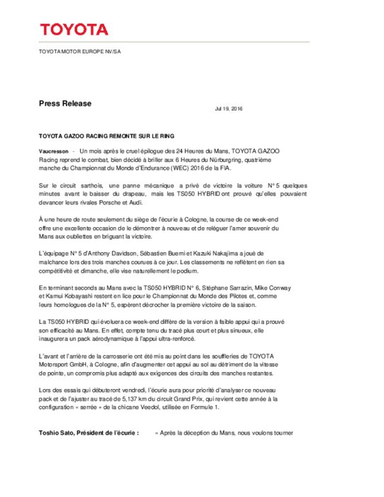 Constructeurs 19 juillet 2016 - 12:00 Un mois après le cruel épilogue des 24 Heures du Mans, TOYOTA GAZOO Racing reprend le combat, bien décidé à briller aux 6 Heures du Nürburgring, quatrième manche du Championnat du Monde d’Endurance (WEC) 2016 de la FIA. PDF (26 Ko) Télécharger