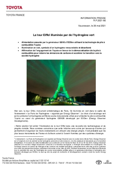 Mardi soir, la tour Eiffel, monument emblématique de Paris, fût illuminée en vert dans le cadre de l’évènement « Le Paris de l’hydrogène » organisé par Energy Observer. Le choix d’un éclairage vert est le symbole d’un hydrogène certifié de source renouvelable utilisé pour alimenter la pile à combustible Toyota au cœur du générateur hydrogène GEH2® développé par EODev (Energy Observer Developments).
