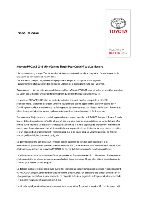 La nouvelle gamme de fourgons légers Toyota PROACE sera dévoilée en première mondiale au Salon des Véhicules Utilitaires de Birmingham qui se tiendra du 26 au 28 avril 2016. Le nouveau PROACE 2016 offre un choix de variantes adapté à tous les usages de la clientèle professionnelle. Disponible en quatre versions (fourgon tôlé, cabine approfondie, plancher-cabine et VP Combi 9 places), deux empattements, trois longueurs de carrosserie et trois niveaux de finitions, il couvre au mieux le segment.