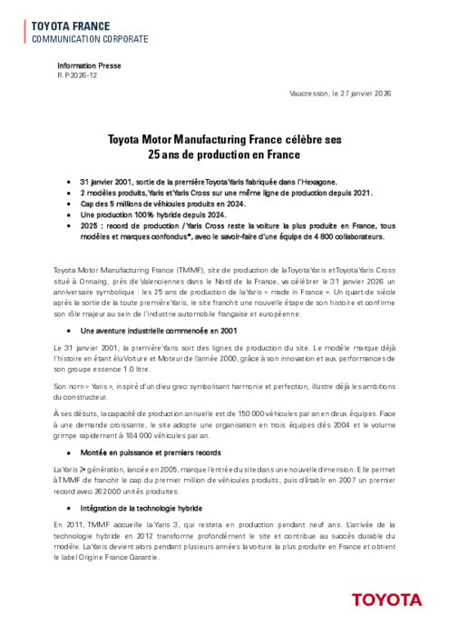 Toyota Motor Manufacturing France (TMMF), site de production de la Toyota Yaris et Toyota Yaris Cross situé à Onnaing, près de Valenciennes dans le Nord de la France, va célébrer le 31 janvier 2026 un anniversaire symbolique : les 25 ans de production de la Yaris « made in France ». Un quart de siècle après la sortie de la toute première Yaris, le site franchit une nouvelle étape de son histoire et confirme son rôle majeur au sein de l’industrie automobile française et européenne.