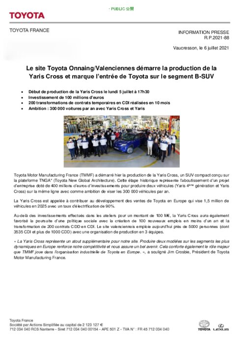 Toyota Motor Manufacturing France (TMMF) a démarré lundi la production de la Yaris Cross, un SUV compact conçu sur la plateforme TNGA (Toyota New Global Architecture). Cette étape historique représente l’aboutissement d’un projet d’entreprise doté de 400 millions d’euros d’investissements pour produire deux véhicules (Yaris 4ème génération et Yaris Cross) sur la même ligne avec comme ambition de viser les 300 000 véhicules par an.