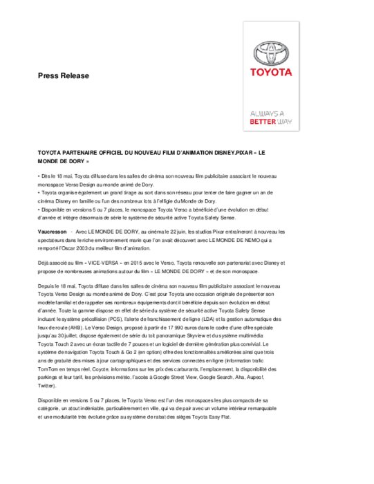 Avec LE MONDE DE DORY, au cinéma le 22 juin, les studios Pixar entraîneront à nouveau les spectateurs dans le riche environnement marin que l’on avait découvert avec LE MONDE DE NEMO qui a remporté l’Oscar 2003 du meilleur film d’animation. Déjà associé au film « VICE-VERSA » en 2015 avec le Verso, Toyota renouvelle son partenariat avec Disney et propose de nombreuses animations autour du film « LE MONDE DE DORY » et de son monospace.