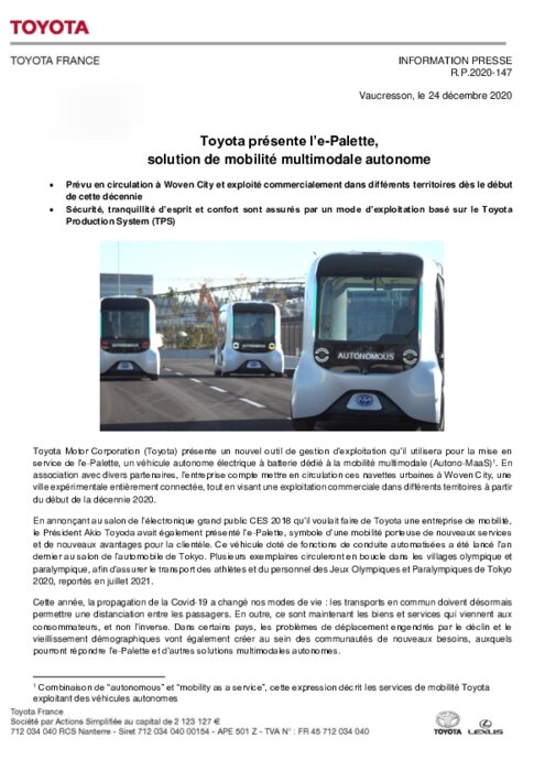 Toyota présente un nouvel outil de gestion d’exploitation qu’il utilisera pour la mise en service de l’e-Palette, un véhicule autonome électrique à batterie dédié à la mobilité multimodale (Autono-MaaS). En association avec divers partenaires, l’entreprise compte mettre en circulation ces navettes urbaines à Woven City, une ville expérimentale entièrement connectée, tout en visant une exploitation commerciale dans différents territoires à partir du début de la décennie 2020.