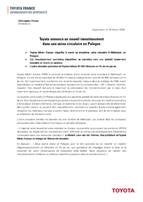 Toyota Motor Europe (TME) a annoncé la création d’une nouvelle usine circulaire à Walbrzych, en Pologne. Ce site d’une superficie de 25 000 m² traitera, chaque année, près de 20 000 véhicules en fin de vie. Cet investissement représente une nouvelle avancée majeure dans la stratégie de TME visant à développer un modèle d’économie circulaire reposant sur les principes des « 3R » (réduire, réutiliser, recycler). Son objectif consiste à maximiser la préservation de l’environnement par le biais d’un traitement rigoureux et systématique des véhicules en fin de vie.