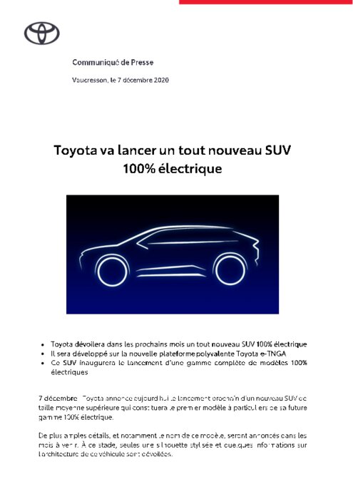 Constructeurs 07 décembre 2020 - 15:40 Toyota dévoilera dans les prochains mois un tout nouveau SUV 100% électrique. Il sera développé sur la nouvelle plateforme polyvalente Toyota e-TNGA. Ce SUV inaugurera le lancement d’une gamme complète de modèles 100% électriques. PDF (312 Ko) Télécharger