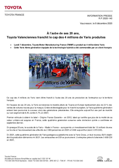 Constructeurs 08 décembre 2020 - 10:25 Lundi 7 décembre, Toyota Motor Manufacturing France (TMMF) a produit sa 4 millionième Yaris. Cette Yaris 4ème génération équipée de la technologie hybride a été commandée par un client français... PDF (583 Ko) Télécharger