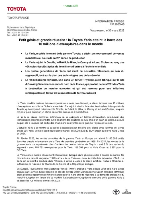 A contre-courant du marché, la marque japonaise a vu ses ventes progresser de 3% en Europe en 2022, notamment grâce à ses voitures hybrides (dont les Yaris et Yaris Cross).