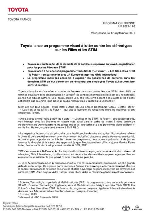 Toyota a la volonté d’accroître le nombre de femmes dans des postes liés aux STIM. Avec 18% de femmes travaillant dans ces domaines en Europe, les données montrent qu’elles sont peu nombreuses à choisir ce type de carrière. Dès l’école, seules 26% des filles s’intéressent à ces sujets or les études ont prouvé que ce chiffre peut presque doubler lorsqu’elles s’identifient à un modèle...