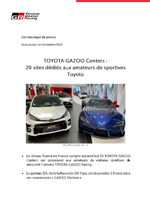 Les 20 TOYOTA GAZOO Centers français sont répartis pour couvrir l’ensemble du territoire. Ils constituent de véritables ambassades du savoir-faire de Toyota en matière de modèles sportifs. Et la meilleure ambassadrice de cette compétence est sans aucun doute l’iconique Toyota GR Supra, dont un exemplaire est à l’essai dans chaque TOYOTA GAZOO Center. La très attendue Nouvelle GR Yaris vient de rejoindre la GR Supra dans ces GAZOO Centers et est disponible à l’essai dès à présent.
