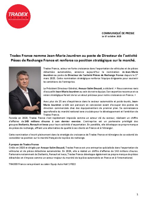 Tradex France, acteur en forte croissance dans l'exportation de véhicules et de pièces détachées automobiles, annonce aujourd'hui la nomination de Jean-Marie Jourdren au poste de Directeur de l'activité Pièces de Rechange France depuis le 1er mars 2025. Cette nomination stratégique renforce l'équipe dirigeante pour soutenir les ambitions de l'entreprise.