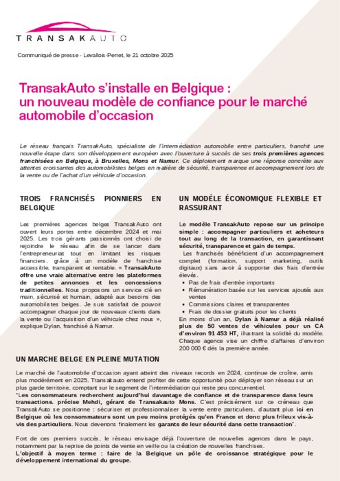VO 21 octobre 2025 - 14:25 Leader français de l’intermédiation automobile depuis 2009, TransakAuto poursuit sa croissance en Europe et s’appuie sur un modèle de franchise accessible, transparent et sécurisé, déjà adopté par plus de 170 entrepreneurs. PDF (366 Ko) Télécharger credit Transakauto