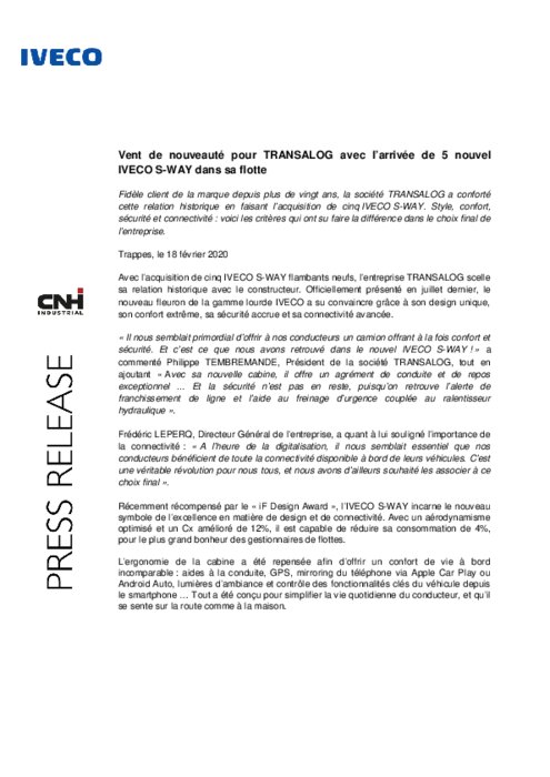 Fidèle client de la marque depuis plus de vingt ans, la société TRANSALOG a conforté cette relation historique en faisant l’acquisition de cinq IVECO S-WAY. Style, confort, sécurité et connectivité : voici les critères qui ont su faire la différence dans le choix final de l’entreprise.