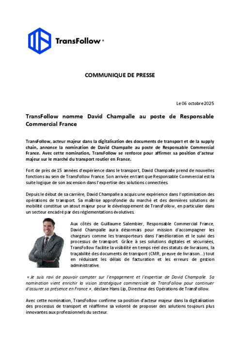 TransFollow, acteur majeur dans la digitalisation des documents de transport et de la supply chain, annonce la nomination de David Champalle au poste de Responsable Commercial France. Avec cette nomination, TransFollow se renforce pour affirmer sa position d’acteur majeur sur le marché du transport routier en France.