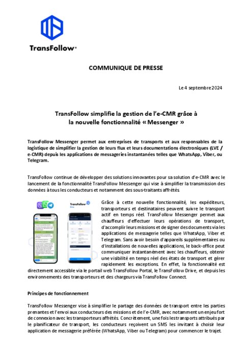 TransFollow Messenger permet aux entreprises de transports et aux responsables de la logistique de simplifier la gestion de leurs flux et leurs documentations électroniques (LVE / e-CMR) depuis les applications de messageries instantanées telles que WhatsApp, Viber, ou Telegram.