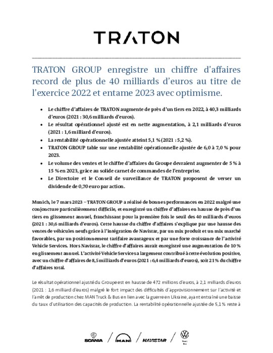TRATON GROUP a réalisé de bonnes performances en 2022 malgré une conjoncture particulièrement difficile, et enregistré un chiffre d’affaires en hausse de près d’un tiers en glissement annuel, franchissant pour la première fois le seuil des 40 milliards d’euros (2021 : 30,6 milliards d’euros).