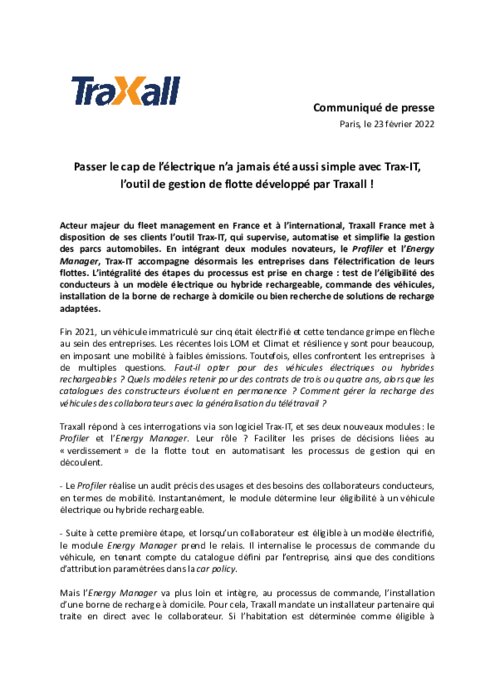 Acteur majeur du fleet management en France et à l’international, Traxall France met à disposition de ses clients l’outil Trax-IT, qui supervise, automatise et simplifie la gestion des parcs automobiles. En intégrant deux modules novateurs, le Profiler et l’Energy Manager, Trax-IT accompagne désormais les entreprises dans l’électrification de leurs flottes. L’intégralité des étapes du processus est prise en charge : test de l’éligibilité des conducteurs à un modèle électrique ou hybride...