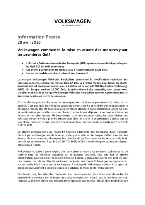 La marque Volkswagen Véhicules Particuliers commence la modification technique des véhicules concernés équipés du moteur type EA 189. Le premier modèle pour lequel les clients pourront bientôt prendre un rendez-vous à l’atelier est la Golf 2.0l TDI Blue Motion Technology (BMT). En Europe, environ 15 000 Golf, équipées d’une boîte manuelle, sont concernées. D’autres modèles de la marque Volkswagen Véhicules Particuliers suivront rapidement dans le processus de mise en œuvre des mesures.