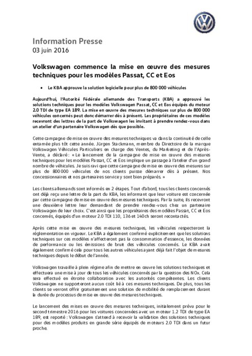 La KBA, l'autorité fédérale de l'automobile, "a approuvé les solutions techniques (proposées par Volkswagen, ndlr) pour les modèles Passat, CC et Eos avec un moteur 2 litres TDI de type EA 189", a indiqué le constructeur allemand dans un communiqué.