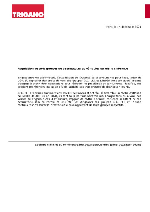 Trigano a confirmé avoir obtenu l'autorisation acquérir 70% du capital et des droits de vote des groupes CLC, SLC et Loisiréo sous condition.