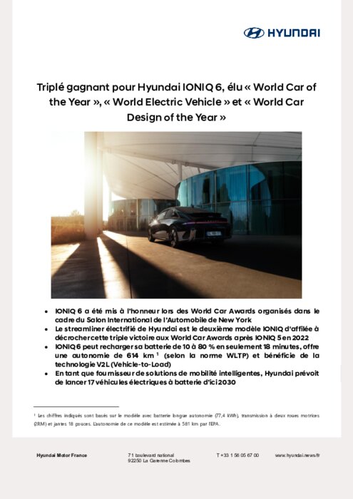 IONIQ 6 remporte le titre de Voiture Mondiale de l'année 2023 à l'occasion du Salon de New York. Elle succède à IONIQ 5, Voiture Mondiale de l'année 2022. Et comme IONIQ 5 l'an passé, IONIQ 6 arrive également première à l'élection de la Voiture Electrique Mondiale de l'année et Design Automobile Mondial de l'année.