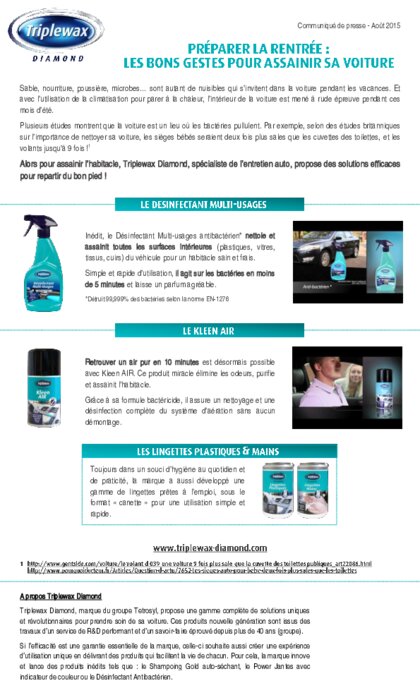 La voiture est un lieu où les bactéries pullulent. Par exemple, les sièges bébés seraient deux fois plus sales que les cuvettes des toilettes, et les volants jusqu’à 9 fois ! Alors pour assainir l’habitacle, Triplewax Diamond, spécialiste de l’entretien auto, propose des solutions efficaces pour repartir du bon pied !