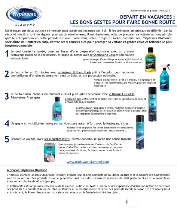 Un français sur deux utilisera sa voiture pour partir en vacances cet été. Si les principes de précaution délivrés par la sécurité routière sont de rigueur pour partir sereinement, il est également utile de préparer sa voiture au long périple qu’elle entreprendra en cette période estivale. Entre vent, soleil, orages et routes caillouteuses, Triplewax Diamond, spécialiste de l’entretien auto, délivre ses 5 conseils clés pour protéger sa voiture et lui garder éclat et brillance.