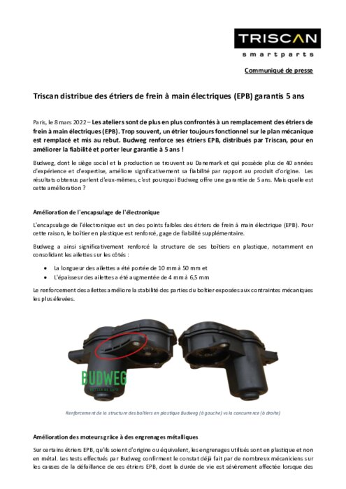 Les ateliers sont de plus en plus confrontés à un remplacement des étriers de frein à main électriques (EPB). Trop souvent, un étrier toujours fonctionnel sur le plan mécanique est remplacé et mis au rebut. Budweg renforce ses étriers EPB, distribués par Triscan, pour en améliorer la fiabilité et porter leur garantie à 5 ans !