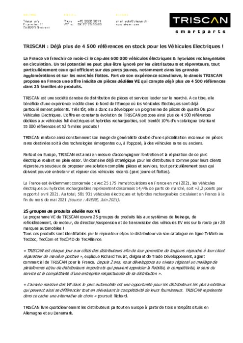 La France va franchir ce mois-ci le cap des 600 000 véhicules électriques & hybrides rechargeables en circulation. Un tel potentiel ne peut plus être ignoré par les distributeurs et réparateurs, tout particulièrement ceux qui officient sur des parcs jeunes, notamment dans les grandes agglomérations et sur les marchés flottes. Fort de son expérience scandinave, le danois TRISCAN propose en France une offre inédite de pièces dédiées VE qui compte déjà plus de 4 500 références...