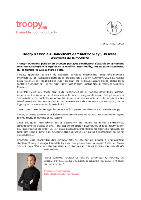 Services 21 mars 2023 - 11:56 Troopy- opérateur parisien de scooters partagés électriques- s’associe au lancement d’un réseau européen d’experts de la mobilité, InterMobility, lors du salon Autonomy, qui se tiendra les 22 & 23 Mars à Paris. PDF (198 Ko) Télécharger