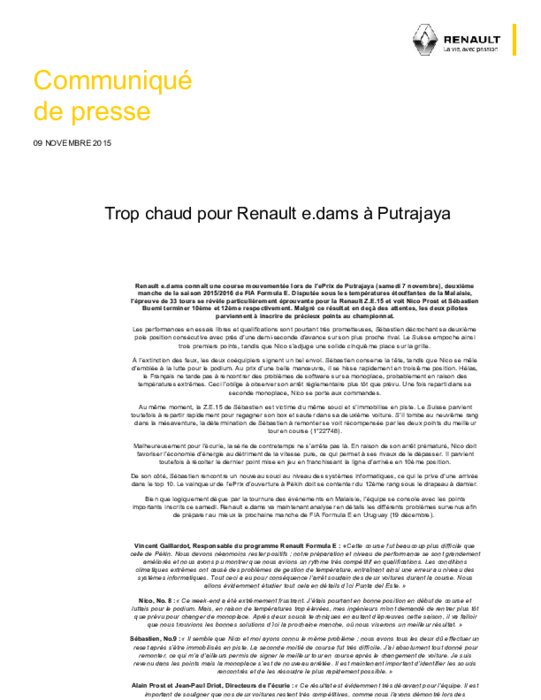 Renault e.dams connaît une course mouvementée lors de l’ePrix de Putrajaya (samedi 7 novembre), deuxième manche de la saison 2015/2016 de FIA Formula E. Disputée sous les températures étouffantes de la Malaisie, l’épreuve de 33 tours se révèle particulièrement éprouvante pour la Renault Z.E.15 et voit Nico Prost et Sébastien Buemi terminer 10ème et 12ème respectivement. Malgré ce résultat en deçà des attentes, les deux pilotes parviennent à inscrire de précieux points au championnat.