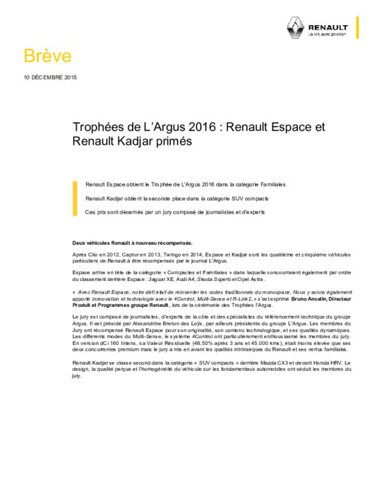 Constructeurs 10 décembre 2015 - 14:02 Renault Espace obtient le Trophée de L’Argus 2016 dans la catégorie Familiales. Renault Kadjar obtient la seconde place dans la catégorie SUV compacts. Ces prix sont décernés par un jury composé de journalistes et d’experts. PDF (82 Ko) Télécharger