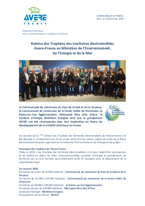 Les lauréats de la 7ème édition des Trophées des territoires électromobiles de l'Avere-France ont été dévoilés le 13 décembre lors d’une soirée réunissant les acteurs publics et privés de la filière électromobile française organisée au ministère de l’Environnement, de l’Energie et de la Mer.