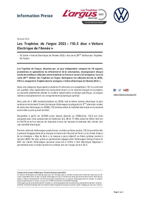 Les Trophées de l’argus, décernés par un jury indépendant composé de 18 experts, journalistes et spécialistes du référentiel et de la valorisation, récompensent chaque année les meilleurs véhicules commercialisés en France à travers 10 catégories. Lors de cette 28ème édition des Trophées de l’argus distinguant les véhicules lancés en 2020, l’ID.3 a remporté le Trophée dans la catégorie «Voiture Électrique de l’Année 2021».