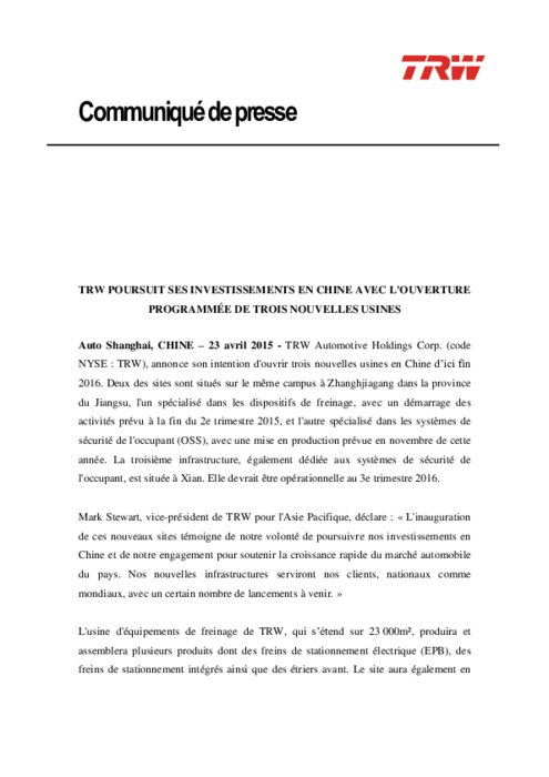 TRW Automotive Holdings Corp. annonce son intention d'ouvrir trois nouvelles usines en Chine d’ici fin 2016. Deux des sites sont situés sur le même campus à Zhanghjiagang dans la province du Jiangsu, l'un spécialisé dans les dispositifs de freinage, avec un démarrage des activités prévu à la fin du 2e trimestre 2015, et l'autre spécialisé dans les systèmes de sécurité de l'occupant (OSS), avec une mise en production prévue en novembre de cette année.